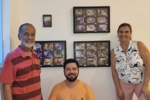 Paulo Peregrino, o filho Gabriel e a esposa Ana Maria posam em frente a quadros com fotos de família. Faltava a foto de 2022, que será colocada agora, com o retorno para casa