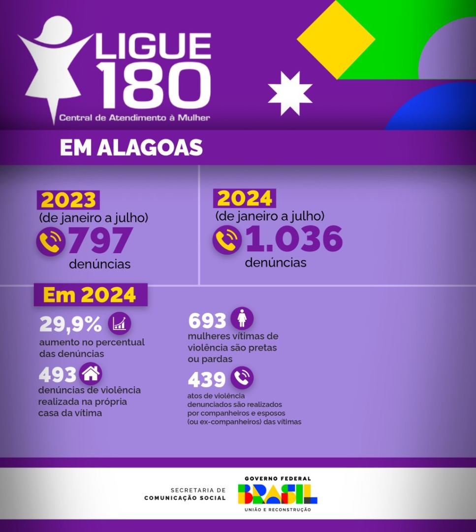 O Ligue 180, dispositivo central na estratégia de enfrentamento da violência contra a mulher no país, já recebeu, até o mês de julho, 84,3 mil denúncias, volume que equivale a um aumento de 33,5% em relação ao mesmo período em 2023. De Alagoas, em 2024, a Central registrou 1.036 denúncias — um aumento de 29,99% em relação ao mesmo período do ano passado.