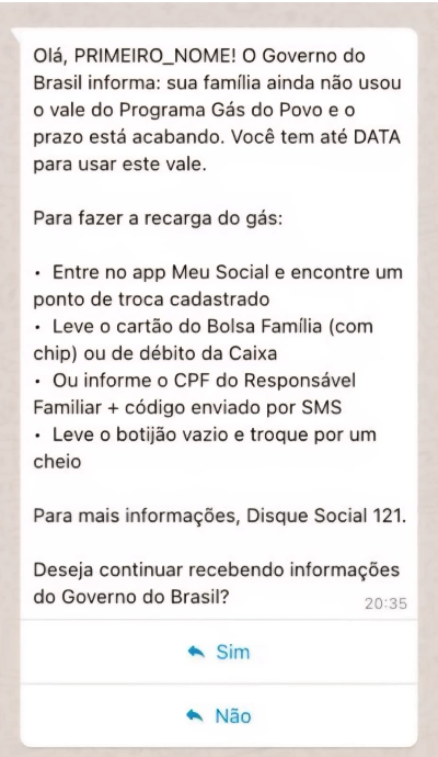 Mensagens pelo WhatsApp voltam a ser enviadas quando o vale está próximo a expirar e a família ainda não usou o vale para a recarga do botijão.