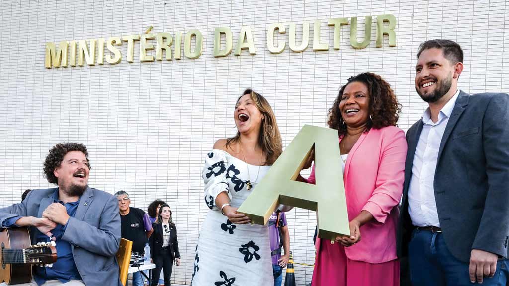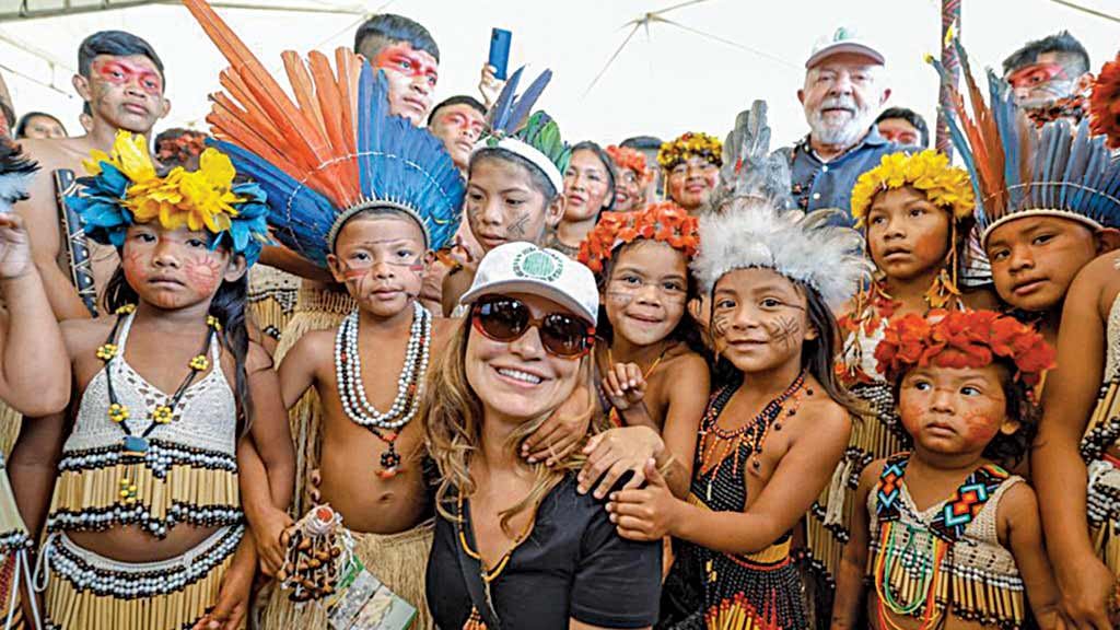 CAUSAS Janja comemora a recriação do Ministério da Cultura com sua indicada para a pasta, a cantora Margareth Menezes, em 29 de março. Abaixo, a primeira-dama visita a Terra Indígena Raposa Terra do Sol, em Roraima, junto com Lula (Crédito: Filipe Araujo/MinC)