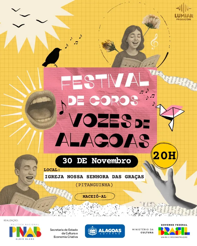 Com a promessa de encantar gerações, amantes e não amantes de coral, nos próximos dias 29 e 30 de novembro, acontece em Porto Calvo e Maceió, o primeiro Festival de Coros Vozes de Alagoas. As apresentações irão ocorrer no dia 29 em Porto Calvo no Auditório da Escola Estadual Nossa Senhora da Apresentação e no dia 30 em Maceió, na Igreja Nossa Senhora das Graças, Pitanguinha.