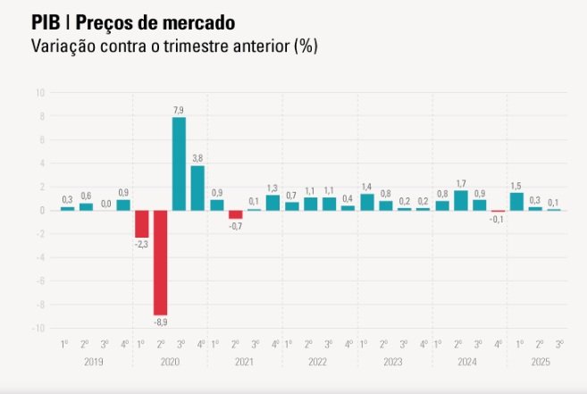 O PIB do Brasil cresceu apenas 0,1% no 3º trimestre de 2025, abaixo das expectativas e confirmando a desaceleração econômica. Embora a indústria e a agropecuária tenham avançado, o setor de serviços ficou praticamente parado, assim como o consumo das famílias. Na comparação anual, o PIB subiu 1,8% e acumula alta de 2,7% em 12 meses. A economia segue pressionada pelos juros altos de 15%, que freiam investimentos e crédito, enquanto o mercado projeta crescimento de 2,16% para 2025 e 1,78% para 2026.