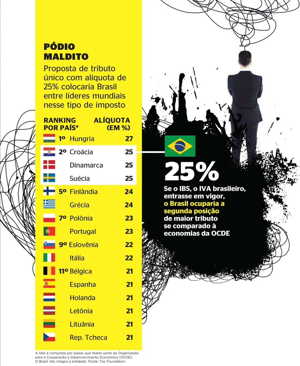 Na proposta em tramitação na Câmara, o imposto único substituiria cinco tributos federais, estaduais e municipais. Ou seja, PIS, Cofins, IPI, ISS e ICMS dariam lugar ao tal IBS, que, por sua vez, seria igual para todos os setores da economia. Do colégio particular à indústria, a alíquota cobrada seria a mesma. Apesar de ela sequer constar no texto, o próprio Appy tem repetido que ficará em 25%. Dessa forma, assegura, manteria-se a atual carga tributária sobre consumo do País. Mesmo assim, essa taxa seria absurdamente alta, sendo a segunda maior do mundo, atrás apenas da Hungria (leia quadro na pág. 25). Porém, outros estudiosos desconfiam dos cálculos. Segundo Paulo Rabello de Castro, ex-presidente do BNDES e do IBGE e PhD em economia pela Universidade de Chicago (EUA), em exercícios aplicados o número é bem diferente. “Já estive algumas vezes com o Bernard Appy e ele nunca demonstrou como chegou a esse número de 25%. Antes, falava até em 20%. Nós usamos algoritmos e calculamos que para se manter a carga de tributos de consumo do Brasil em um imposto único, com somente uma alíquota, seria necessário taxar em 29% para se manter a atual máquina pública”, diz Paulo Rabello. “Por isso, é que eu digo que essa turma está querendo fazer um experimento de laboratório com um avião chamado Brasil em pleno voo”, complementa.