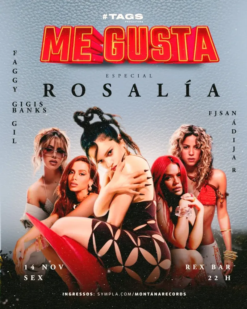 Na sexta-feira (14), às 22h, o Rex Bar abre as portas para uma homenagem vibrante a Rosalía, uma das artistas mais marcantes da música contemporânea. A festa ME GUSTA, ROSALÍA celebra a força e o talento da cantora espanhola que conquistou o mundo ao misturar flamenco, pop eletrônico e reggaeton.
