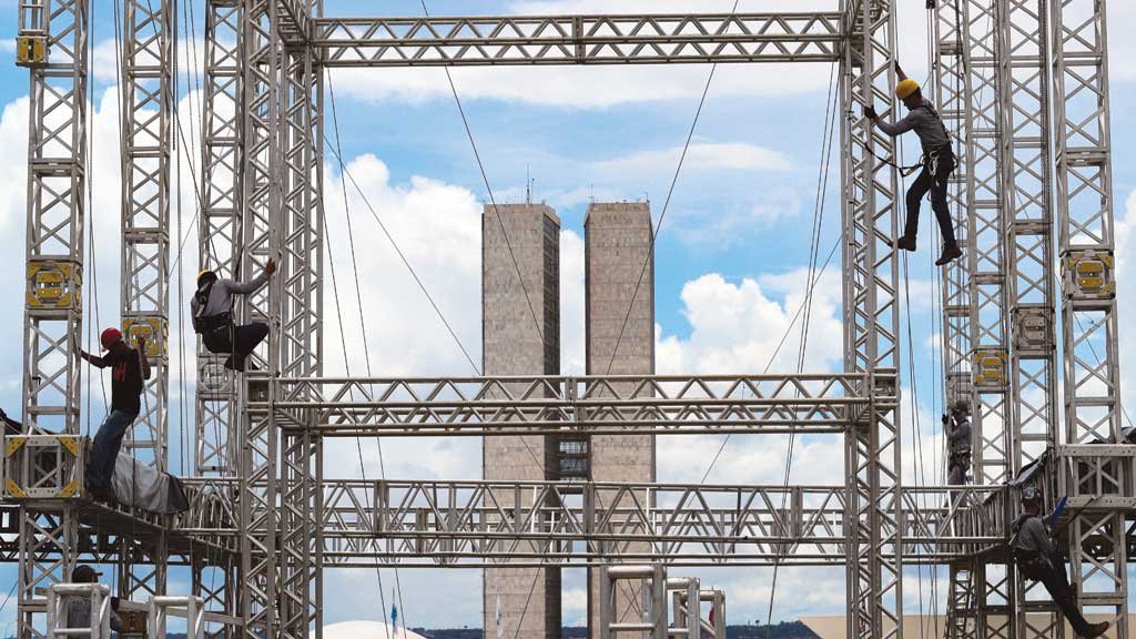 “LULAPALOOZA” Montagem do palco em Brasília: shows começam ao meio-dia, seguidos da solenidade no Planalto às 17h (Crédito:WILTON JUNIOR)